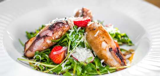 A potom k nám prišiel prvý chod v podobe sviežeho ceviche z lososa a teplého šalátu s plnenými kalamármi. Obidve jedlá boli veľmi chutné, nápadité a štedré. Ceviche je predjedlo alebo hlavný chod zo surových morských (aj sladkovodných) rýb marinovaných v šťave z citróna alebo limetky, dochutený soľou a čili. Náš ceviche z lososa bol výborne dochutený koriandrom a mangom, dookola na malých kopčekoch jogurtu boli poukladané kúsky čili. Stačilo zahryznúť a prvé dojatie bolo na svete. Teplý rukolový šalát s plnenými kalamármi nás preniesol na chvíľku do Chorvátska a zaspomínali sme si na letnú dovolenku. Veru, na ligne už nemusíme čakať celý rok :) V kombinácii s jahodami a šunkovou plnkou boli naozajstnou lahôdkou.
