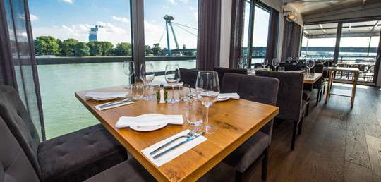 Z reštaurácie je nádherný výhľad na Bratislavský hrad na jednej strane a UFO na strane druhej. My sme ju navštívili večer a odmenou nám bola romanticky osvetlená panoráma hlavného mesta. Interiér reštaurácie je zariadený veľmi vkusne, moderne, žiadne prehnané doplnky. Príjemne tlmené svetlo a nevtieravá jazzová hudba nám po celý čas umocňovali skvelý pocit z tohto nevšedného priestoru na Dunaji. Navyše nás čakal usmievavý personál, ochotný, no nevtieravý a pripravený ponúknuť 100% servis. Dojem z reštaurácie pred prvým sústom bol na jednotku.