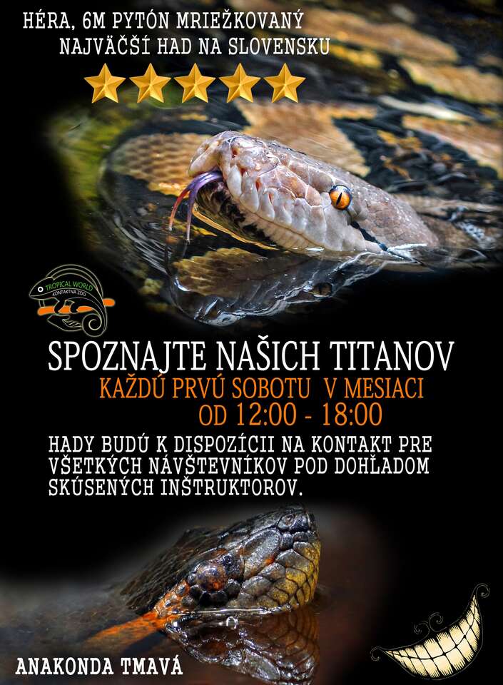 Tropical World je prvou kontaktnou zoologickou záhradou s plazmi na Slovensku. V Zoo si môžete pohladkať mláďatá kajmana či si dokonca nechať okolo seba ovíjať obrovské hady. Tí najodvážnejší môžu dokonca na vlastnej koži zažiť ohromnú silu tela samice mriežkovaného pytóna menom Héra. Héra je najväčším chovaným hadom na Slovensku a váži až 60 kilogramov.Ak Vás však takýto blízky kontakt neláka, môžete si zvieratá pokojne obzerať len z diaľky.